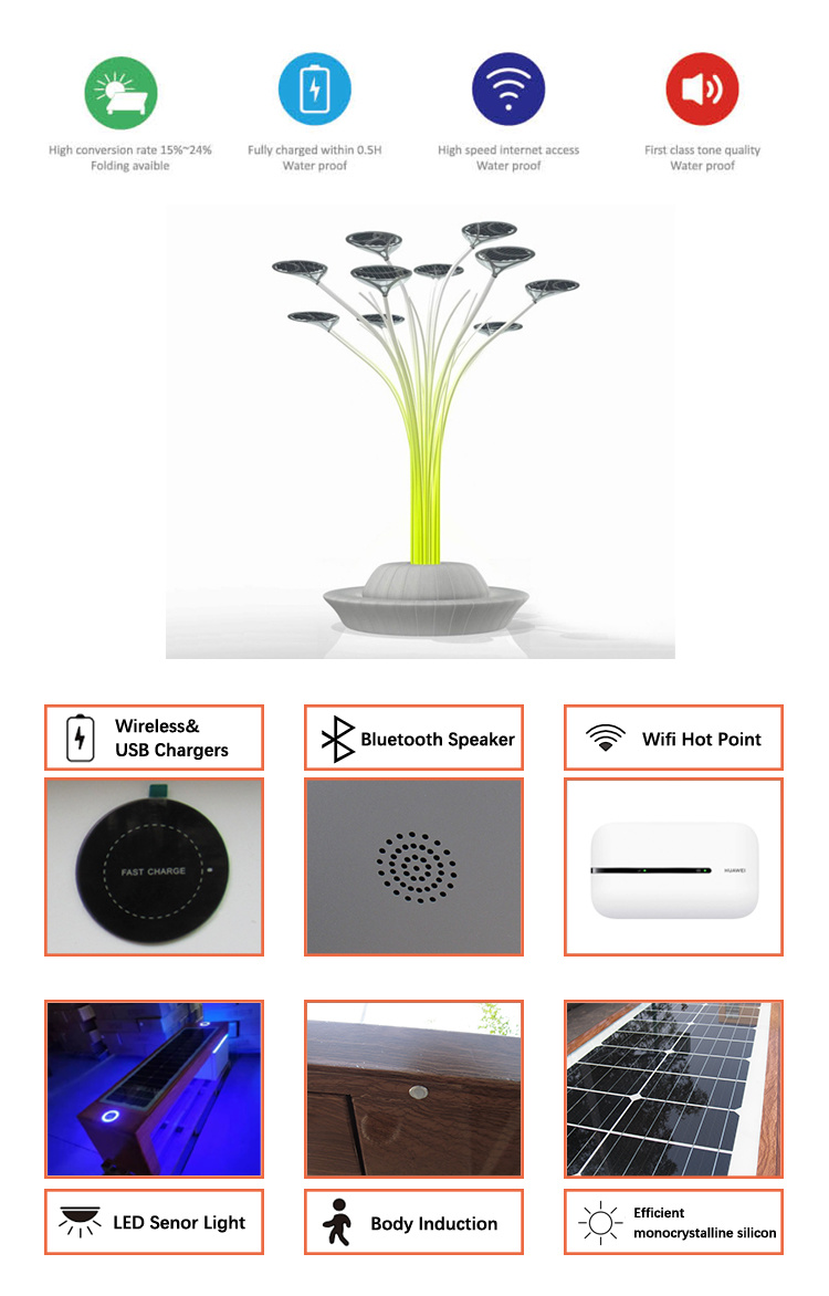 The ddk solar bench is mainly composed of metal steel main structure, solar panels, batteries, solar controllers, solar smart inverters, WIFI advertising routers, 4pcs of USB3.0 fast chargers, 2pcs of wirelss charger holder. Bluetooth Speaker built-in . LED energy-saving lamps. It can accommodate 5 people to rest at the same time.It is safe, reliable and long-lasting.