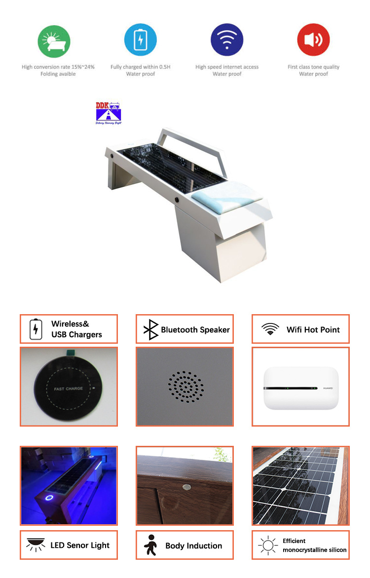 The ddk solar bench is mainly composed of metal steel main structure, solar panels, batteries, solar controllers, solar smart inverters, WIFI advertising routers, 4pcs of USB3.0 fast chargers, 2pcs of wirelss charger holder. Bluetooth Speaker built-in . LED energy-saving lamps. It can accommodate 5 people to rest at the same time.It is safe, reliable and long-lasting.