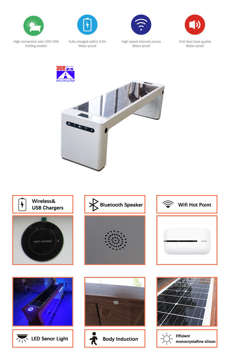 The ddk solar bench is mainly composed of metal steel main structure, solar panels, batteries, solar controllers, solar smart inverters, WIFI advertising routers, 4pcs of USB3.0 fast chargers, 2pcs of wirelss charger holder. Bluetooth Speaker built-in . LED energy-saving lamps. It can accommodate 5 people to rest at the same time.It is safe, reliable and long-lasting.